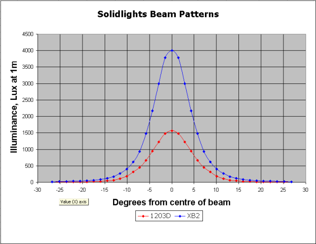 The Solidlights XB2 uses the latest in LED and optical technology to achieve a typical maximum light output from the LEDs of 340 lumens. The beam pattern of the XB2 is tailored to give you a great view of the road ahead as well as picking out hazards and road signs. Click on the tiny graph to see a plot of the XB2's beam pattern.